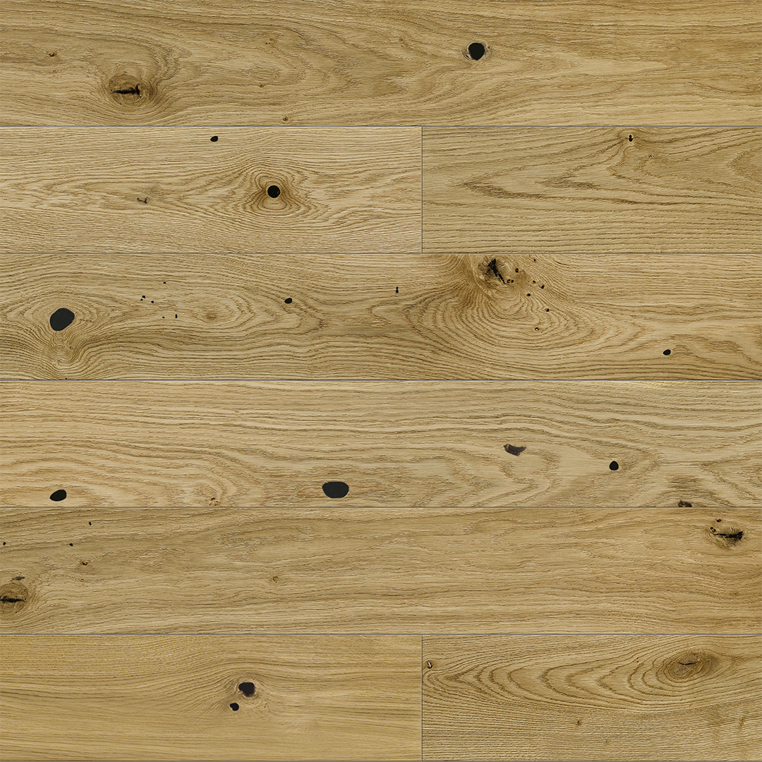 Sortierung und Oberfläche: Lassen Sie sich von der zeitlosen Schönheit der Echtholz-Landhausdiele Eiche Topas verzaubern. Mit ihrer rustikalen Country-Sortierung schafft sie eine harmonische Atmosphäre, die sich perfekt in unterschiedlichste Wohnstile integriert. Die natürliche Wärme des geölten Eichenholzes sorgt für eine behagliche Stimmung in jedem Raum – ohne sich aufzudrängen. Sie wird vielmehr zum sanften Ruhepol, der Sie den Alltag vergessen lässt. Jede Diele erzählt ihre eigene Geschichte: lebendige Farbnuancen, markante Astsellen und die natürlichen Strukturen des Holzes verleihen Ihrem Boden eine ganz besondere Ausstrahlung. Die Maserungen, ausgespachtelten Astlöcher und das malerische Farbenspiel fügen sich zu einem harmonischen Gesamtbild, das Ihrem Zuhause einen authentischen, natürlichen Charme verleiht. Die natur geölte und gebürstete Oberfläche der Landhausdiele Eiche Topas verstärkt den natürlichen Charakter des Holzes und sorgt für eine besonders angenehme Haptik, die den Boden nicht nur visuell, sondern auch in seiner Textur zu einem besonderen Erlebnis macht.